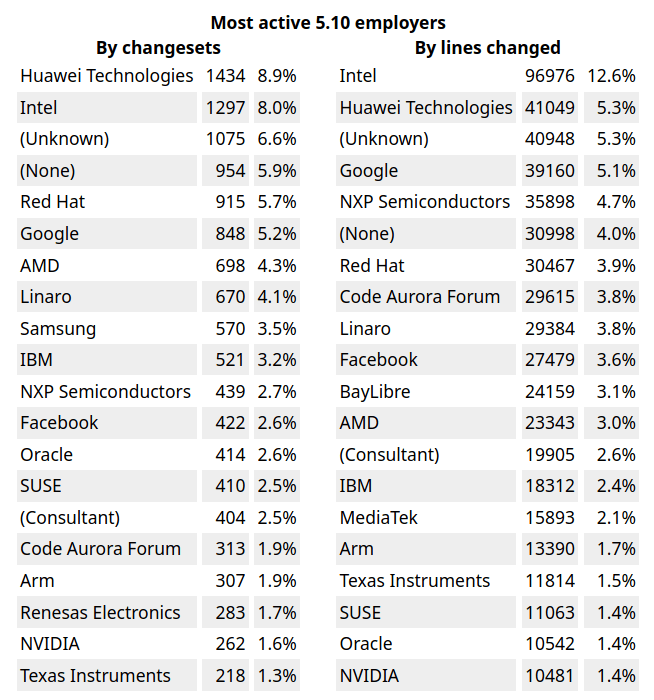 Una precisazione importante: dovessimo unire i dati di Red Hat e IBM, che ci risultano essere una sola azienda, avremmo un nuovo vincitore, ma ciò non toglie come la classifica abbia in Huawei ed Intel (in particolare nell’ambito delle linee di codice modificate) i due assoluti dominatori.