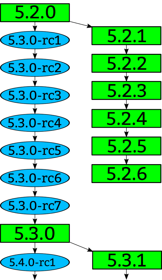 Le versioni sono sequenziali e, sebbene abbiamo imparato negli anni a capire che la Major Release venga decisa un po’ a caso in base alle sensazioni di Linus Torvalds, numeri alti significano versioni più recenti. Ciascuna release Stable viene pubblicata con una cadenza costante, con un ciclo di sviluppo che dura in media 10 settimane, e la struttura è ben riassunta nello schema pubblicato: