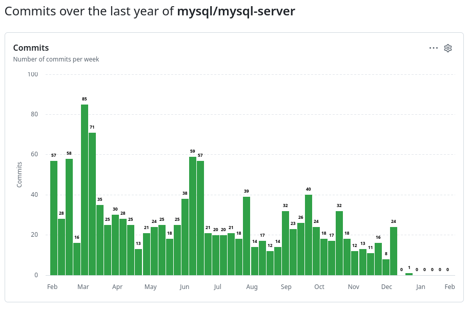 Nell’arrivare a quella conclusione ci siamo basati essenzialmente su due immagini. La prima arrivava dall’articolo di DevClass dal titolo “Open source MySQL repository has no commits in more than three months“, ed era questa: