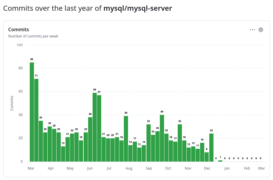 Infatti notizie per qualche verso inquietanti arrivano dal portale DevClass che nell’articolo “Open source MySQL repository has no commits in more than three months” mostrano come all’interno del repository della versione open-source di MySQL, https://github.com/mysql/mysql-server, non vi siano contributi da più di tre mesi: