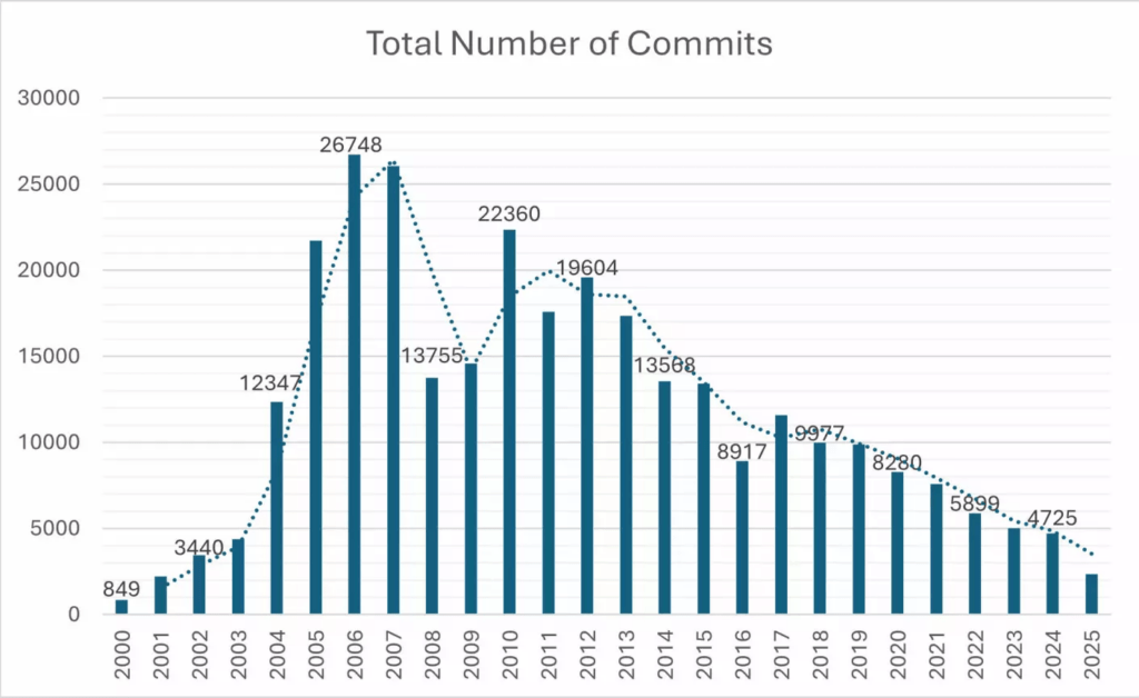Come analizza l’articolo non può essere un caso, e per rendere ulteriormente chiare le idee presenta un ulteriore grafico nel quale il declino di commit negli ultimi anni appare inesorabile: