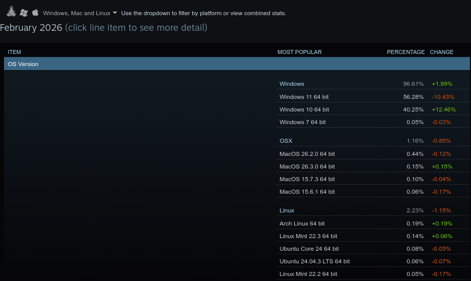Nel leggere i risultati del sondaggio indetto da Valve, raccontato in questo articolo di Phoronix, ho avuto una sensazione di deja-vu. Una rapida ricerca ha confermato i sospetti: un anno fa, di questi tempi, avevamo pubblicato l’articolo “Se cominciamo così anche il 2025 NON sarà l’anno del Desktop Linux, almeno stando ai dati del survey di Steam” ed il titolo quest’anno avrebbe potuto essere del tutto identico, fatto salvo per l’anno di riferimento che, per l’appunto, è il 2026.