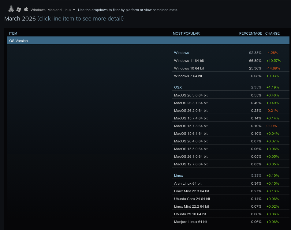 Pare infatti che lo Steam Survey, rispetto al mestissimo 2,33% mostrato in febbraio, abbia raggiunto il nuovo record di 5,33%: